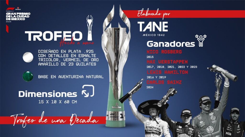 La historia reciente del Gran Premio de México no solo se escribe con motores y velocidad. Desde hace una década, también se cuenta en plata. La casa joyera mexicana TANE volverá a entregar el trofeo oficial del FORMULA 1 GRAN PREMIO DE LA CIUDAD DE MÉXICO Presentado por Heineken, una pieza que se ha convertido en parte esencial de la identidad del podio en el Autódromo Hermanos Rodríguez.