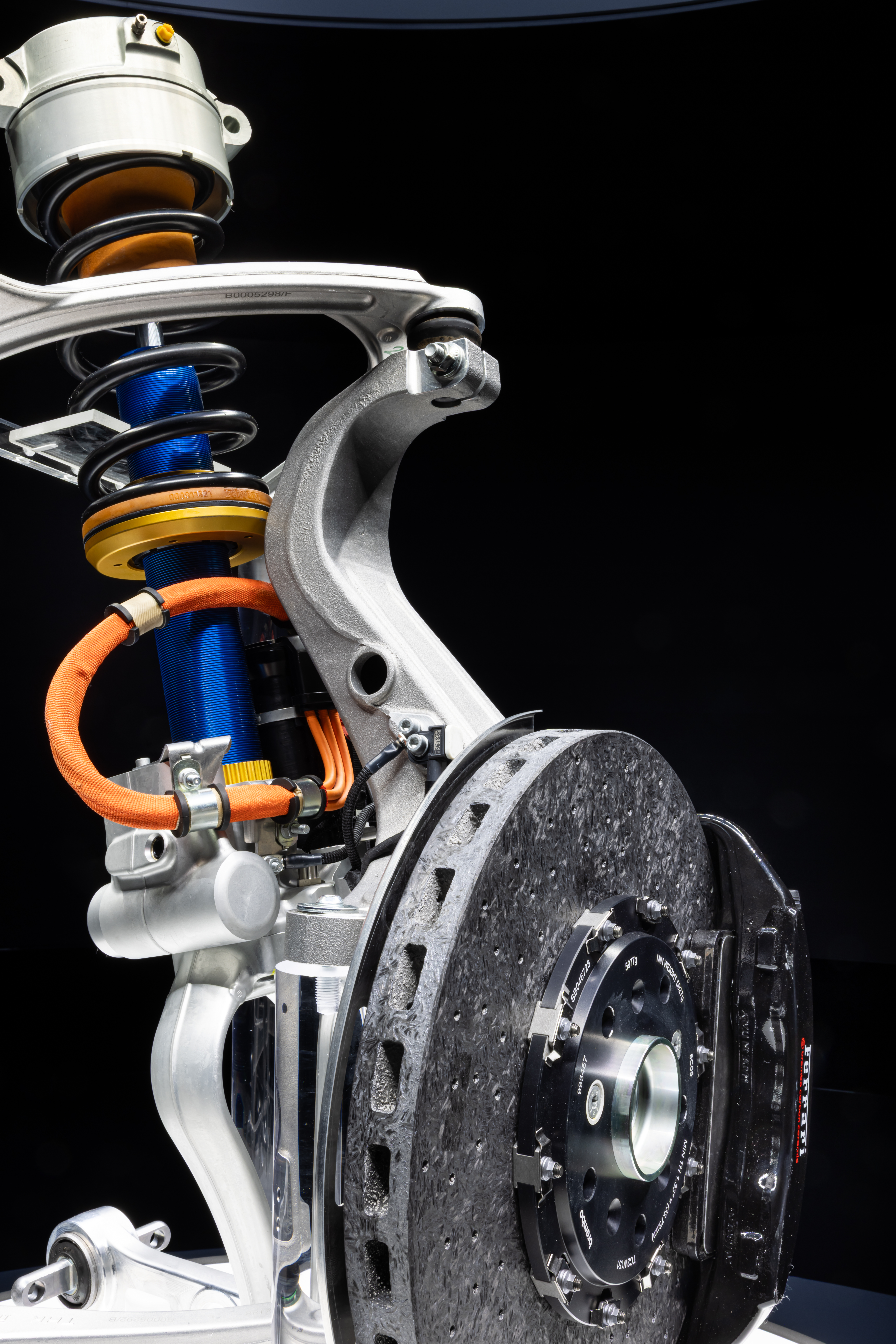 La batería está completamente integrada en el piso del vehículo, lo que baja el centro de gravedad en 80 milímetrosrespecto a un modelo de combustión. Este diseño, junto con una nueva suspensión activa de tercera generación, optimiza la estabilidad, el confort y la agilidad. El sistema ajusta en tiempo real la tracción, la dirección y los amortiguadores, actualizando sus parámetros 200 veces por segundo.