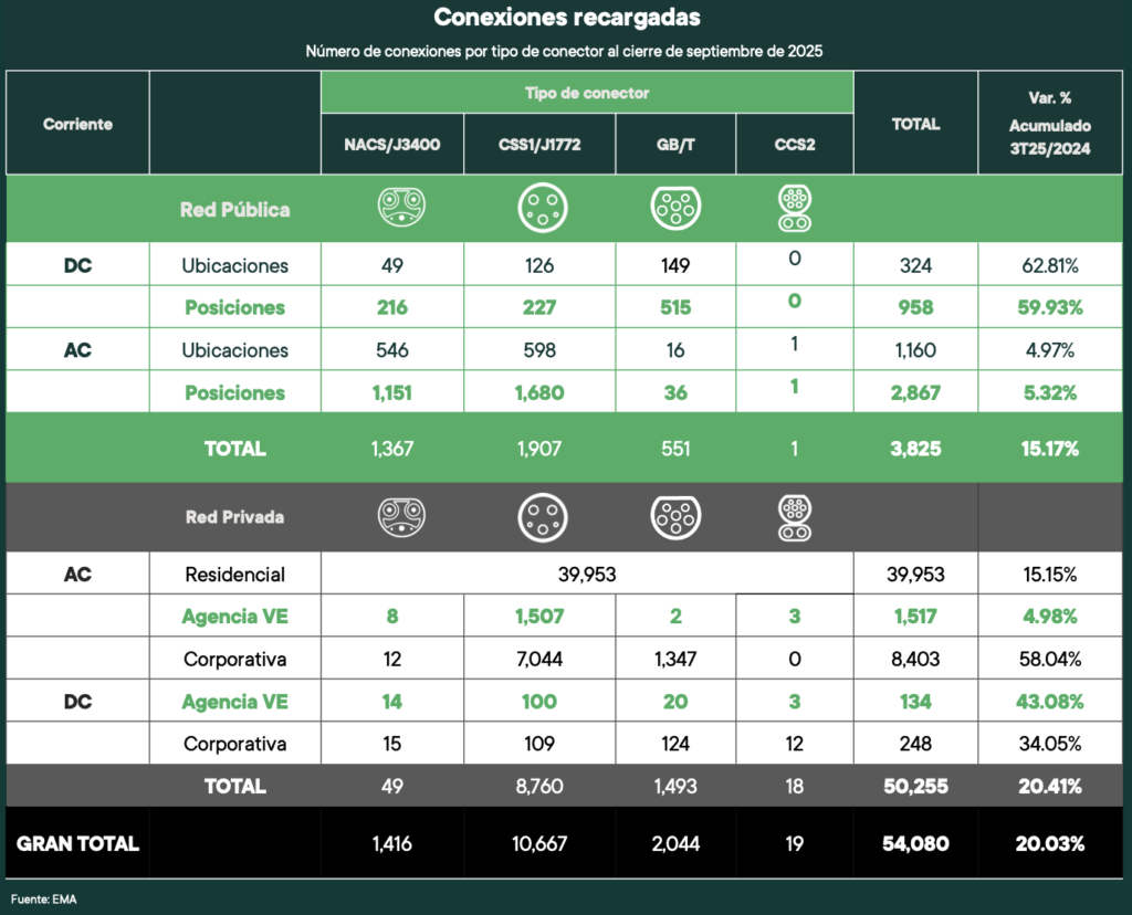 México cuenta hoy con 54,080 posiciones de carga —entre públicas y privadas—, lo que representa un aumento del 20 por ciento en comparación con el año pasado.