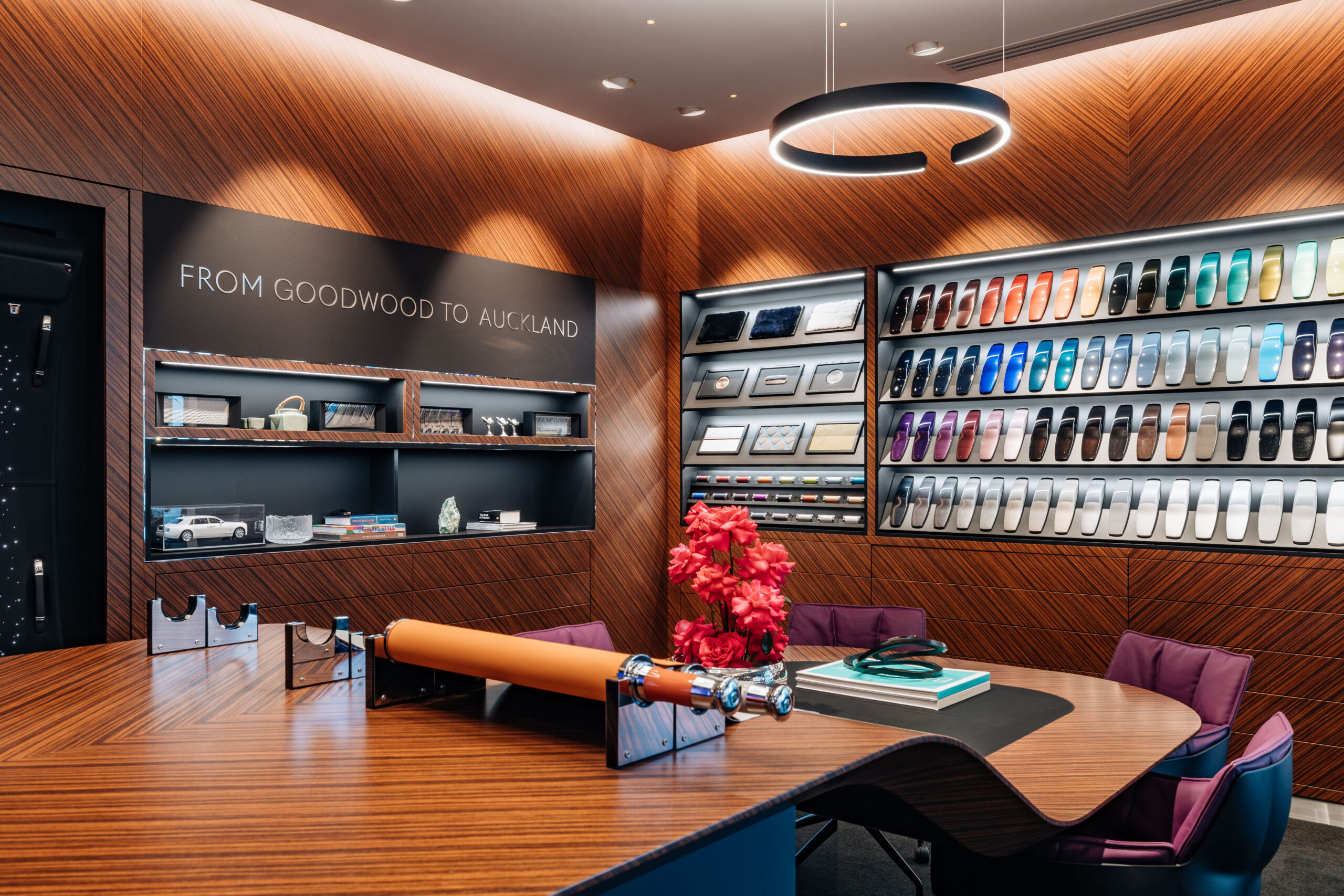 En el centro del espacio se encuentra el Bespoke Commissioning Atelier, un entorno destinado a la exploración de materiales, texturas y detalles que permiten configurar cada vehículo de manera única. Desde maderas raras hasta bordados finos, el atelier ofrece una muestra tangible del nivel de personalización que la marca permite.