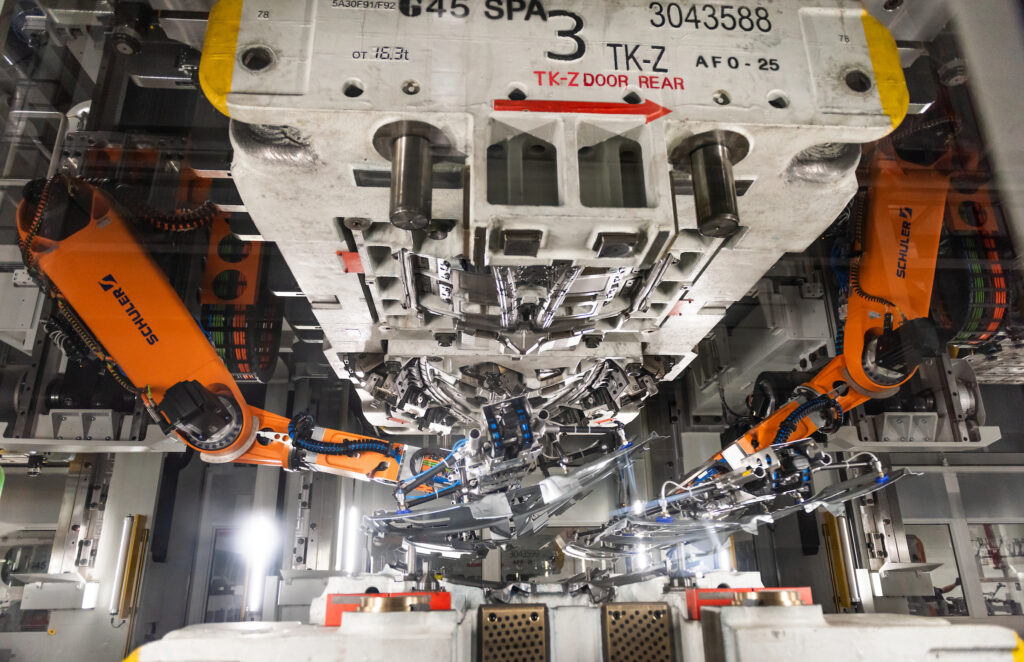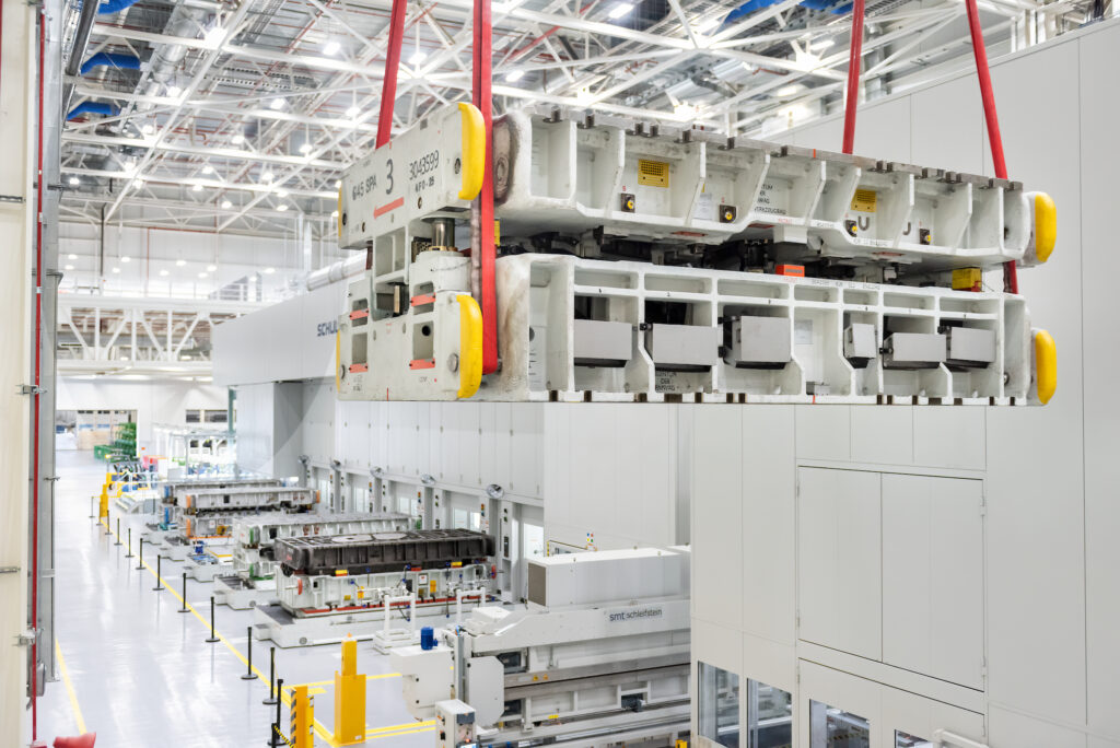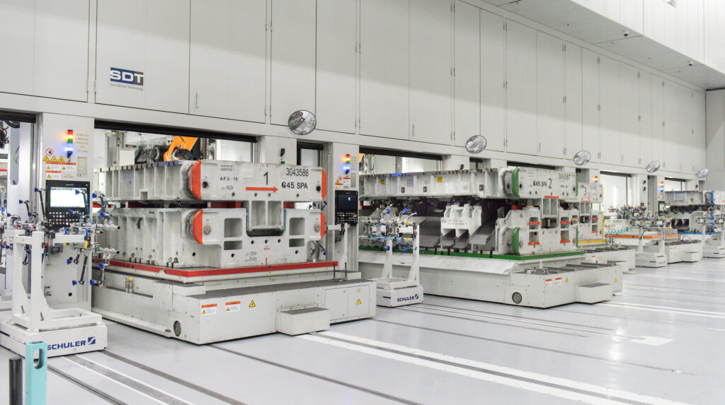 La línea está equipada con tecnología de servomotores de vanguardia, lo que permite a BMW Group producir grandes cantidades de componentes de manera muy eficiente. Una grúa elevada mueve la herramienta de prensa (troquel) correcta a cada estación. Las secciones de lámina se alimentan en la primera estación de prensa y se transfiere de una estación a otra mediante una tecnología de automatización tipo robot, denominada «alimentador de travesaño», para operaciones adicionales de conformado y recorte. La línea puede ejecutar hasta 18 operaciones por minuto, lo que significa que se pueden producir más de 10,000 componentes cada día, dependiendo del tamaño.