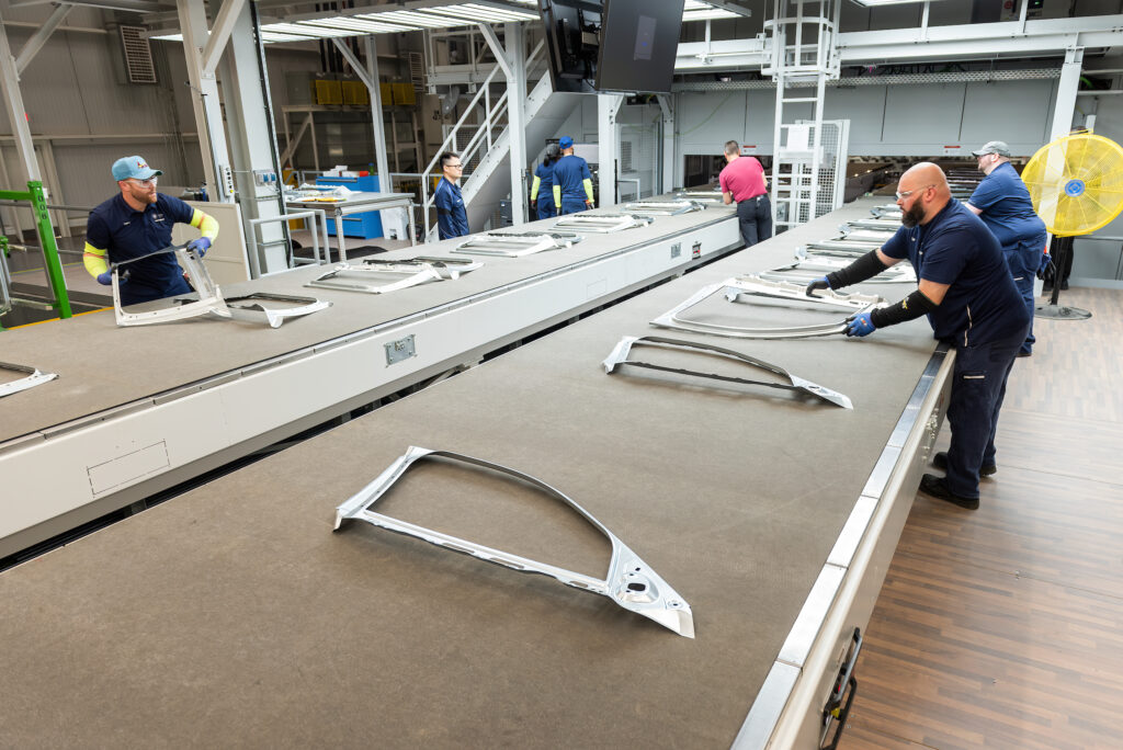 Después de que se estampan las piezas, pasan al control de calidad para su inspección, utilizando iluminación especial que imita la luz natural del día. Las piezas estampadas se apilan luego en contenedores, listas para su entrega a la sección de carrocería para su procesamiento adicional.