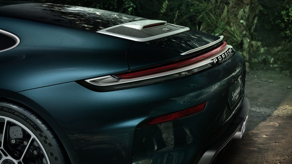La carrocería del GT3 está pintada en Forest Green Metallic, un tono profundo que cambia según la luz y evoca la vegetación densa de la Amazonía. Elementos como los espejos, manijas, alerón y molduras traseras están acabados en Centenaire Silver, un color que remite a los primeros Porsche 911 de la década de 1960. Las ruedas de aluminio forjado, en medidas de 20 y 21 pulgadas, también presentan detalles en verde y plata.