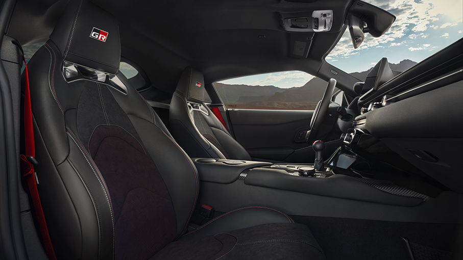 El habitáculo cuenta con elementos diseñados específicamente para esta serie final: cinturones en color rojo, reposacabezas con el emblema GR bordado, palanca de velocidades forrada en piel con costuras contrastantes y cubiertas en los portavasos. Los asientos deportivos ofrecen 12 ajustes eléctricos y el parabrisas acústico contribuye a reducir el ruido exterior.