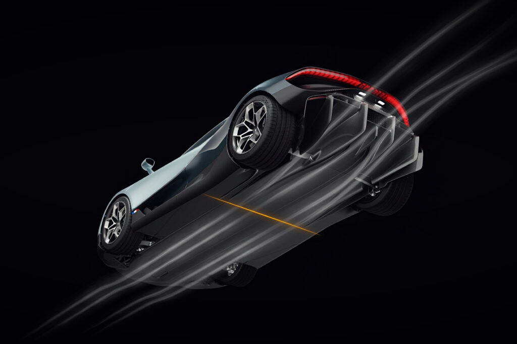 El contraste visual de la parte trasera refuerza este concepto: un conjunto de luces estilizado se enfrenta a las superficies técnicas del difusor, logrando eficiencia aerodinámica y una fuerte presencia visual.