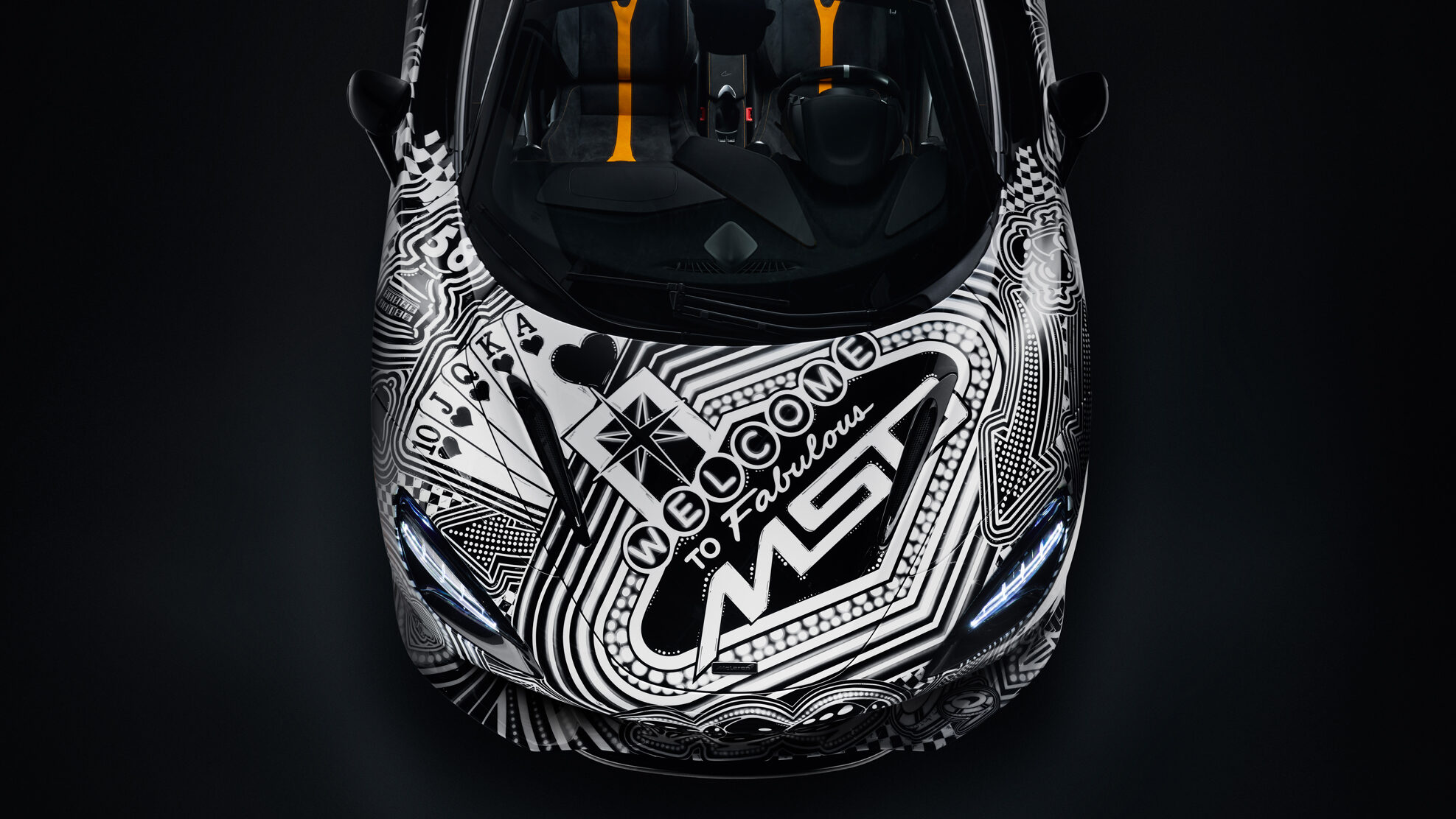 En lugar de recurrir al brillo característico de Las Vegas, el auto utiliza una propuesta monocromática compuesta por líneas pintadas a mano que reinterpretan la arquitectura, el movimiento y los símbolos más reconocibles de la ciudad. Este enfoque, denominado Sketch in Motion, incorpora elementos urbanos y referencias a la historia de McLaren en el automovilismo.